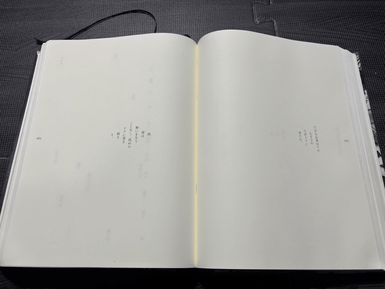 これ、よく縦書きで翻訳したなぁと思う。というか原書はどうなってるんだ。横書きだと、縦書きほどタイポグラフィによる一方向の運動性を持たせにくい気がするが。(左ページ下から右ページ上へとジグザグに戻る軌跡になってしまうので)